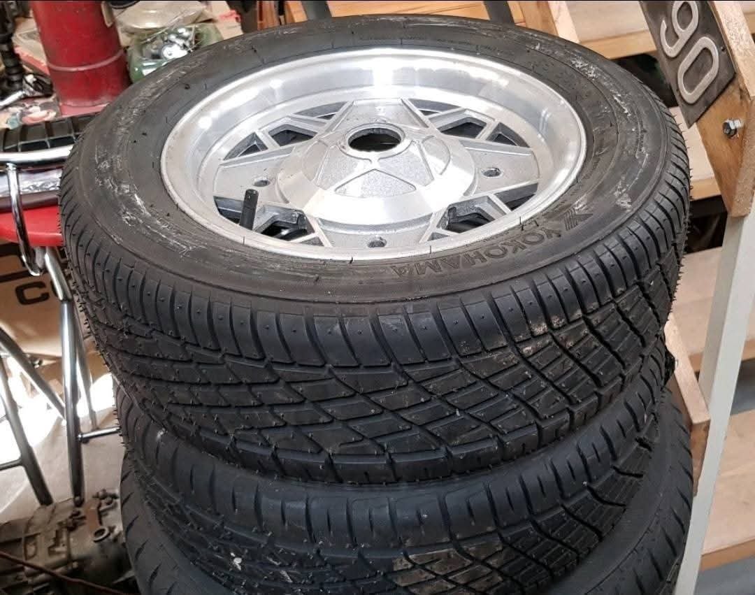 Disponibili 4 cerchi in lega canale differenziato da 12″ con gomme nuove Yokohama misura 165 per Fiat 500 preparazione Abarth / Giannini Automobili.